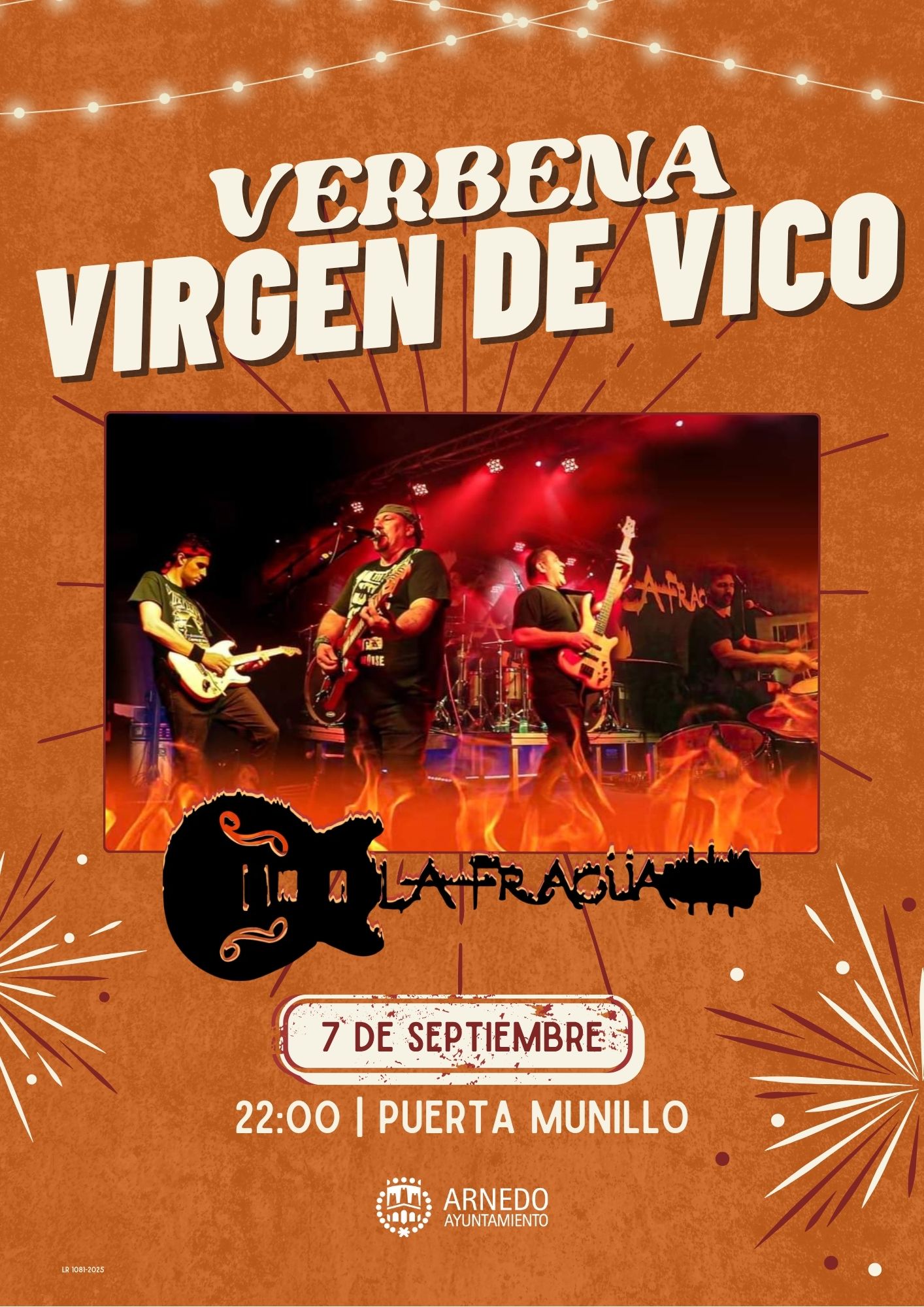 El programa cultural de Arnedo también incluirá en el marco de la festividad de la Virgen de Vico, el domingo 7 de septiembre, a partir de las 22:00 horas, la Verbena de la Virgen de Vico, que invitará a todos a disfrutar de la música en vivo en la Puerta Munillo. La banda La Fragua Rock será la encargada de poner la música en la víspera de la patrona. Este grupo de versiones es conocido por su potente directo y su capacidad para reinterpretar grandes clásicos de la música nacional e internacional. El repertorio abarcará temas de los años 60 hasta hoy, con versiones renovadas de canciones de artistas y bandas como Dire Straits, Pink Floyd, Queen, The Beatles, Los Rebeldes, U2, Fito, Santana, Hombres G, Sabina, Loquillo, Extremoduro, entre muchos otros.