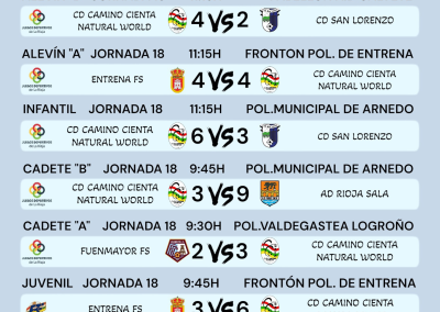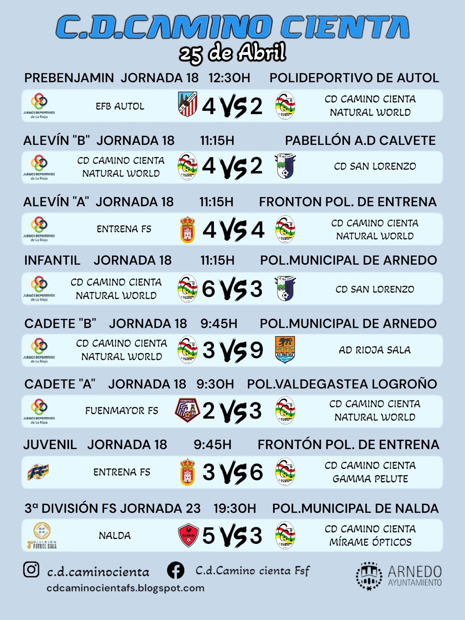 Resultados de los partidos de futsal disputados por el Club Camino Cienta durante el fin de semana 25-26 de abril: