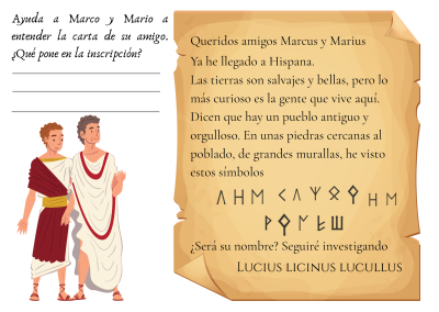 En esta página podrás descargar un PDF con el alfabeto celtíbero e información sobre las téseras de hospitalidad, objetos usados con multitud de propósitos que suelen aparecer inscritos. Además, también podrás poner en práctica lo que hayas aprendido, ayudando a Marcus y a Mario a entender el mensaje de su amigo o escribiendo tu propio nombre en el alfabeto celtíbero.