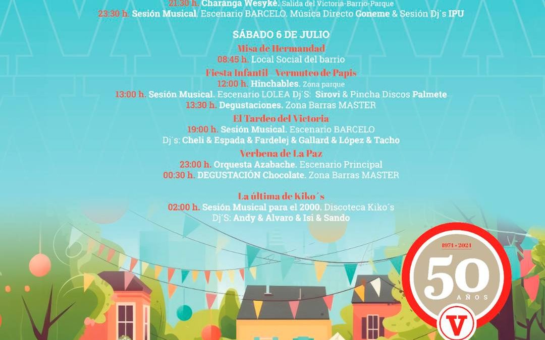 FIESTAS DEL BARRIO DE LA PAZ 2024 – 50 ANIVERSARIO DEL VICTORIA VIERNES 5 DE JULIO Concurso de Dibujo Infantil. Local Social del Barrio. Tema: Barrio La Paz. 18.00 h.– Niñ@s de 3 a 6 años. 19.00 h.- Niñ@s de 7 a 12 años. Entrega de premios sábado 13.00 h. 21.30 h....